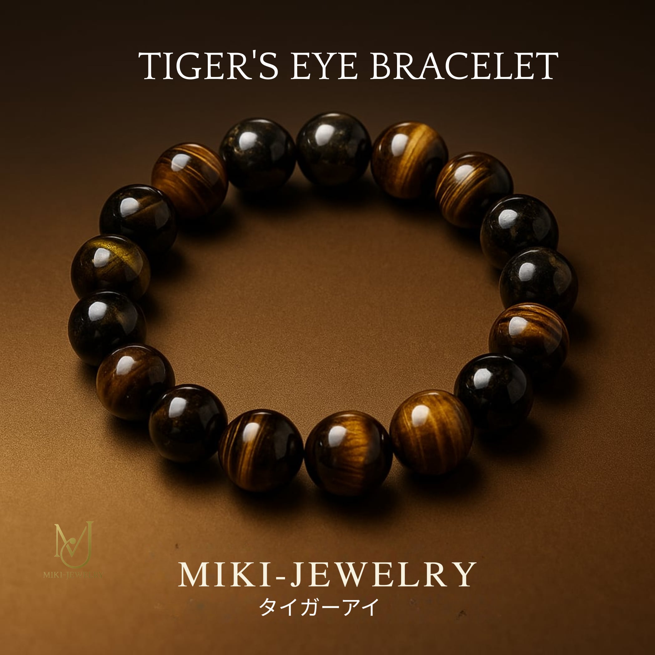 温かみのあるブラウンとゴールドの光沢を放つ、MIKI-JEWELRYのタイガーアイブレスレットです。14mmの大粒ならではの存在感で、見る人に安心感と自信を与える特別なアイテムです。