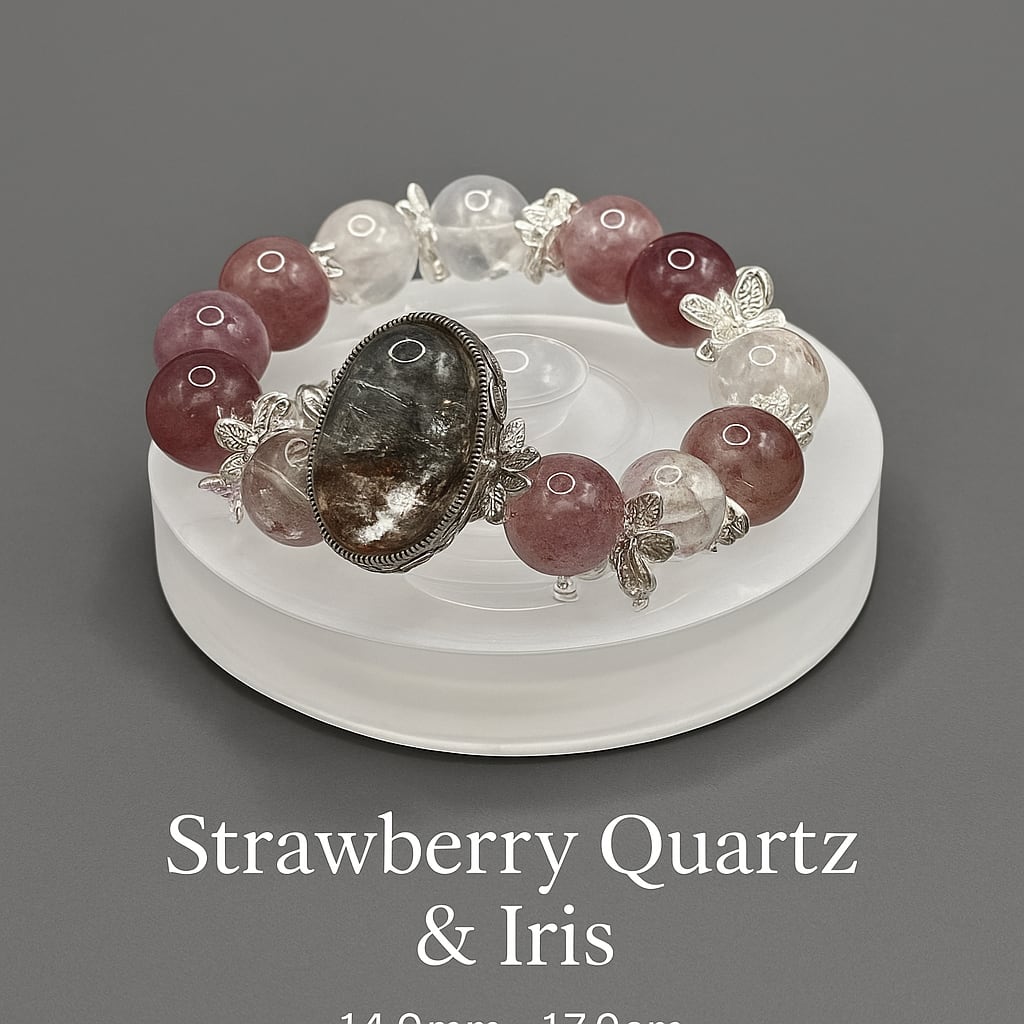 14mm/17cmmmのサイズ感で、ストロベリークォーツの鮮やかなピンクとアイリスの繊細な色合いが美しく調和しています。カジュアルなファッションはもちろん、特別なシーンでも注目されるデザインが、あなたの魅力を引き立てます。