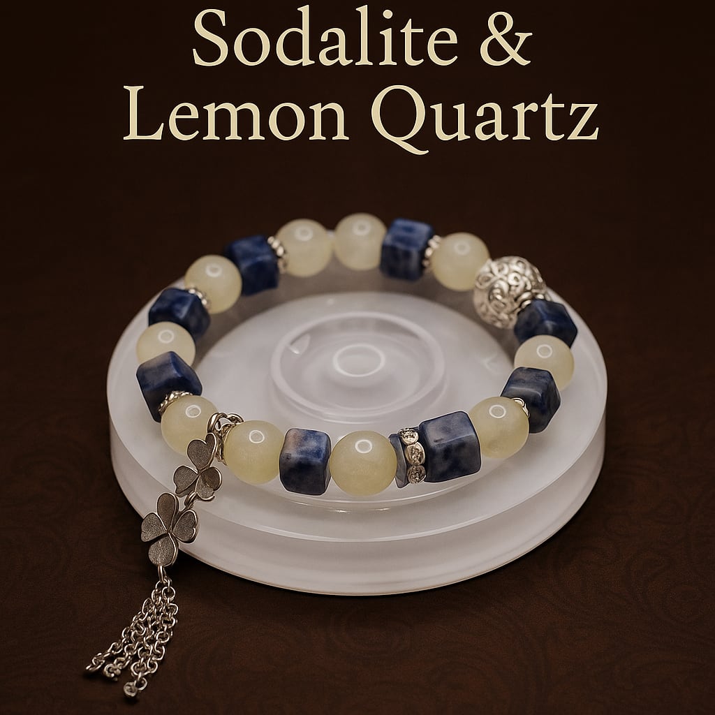 ソーダライト&レモンクォーツ 11.7mm/19cm【Sodalite & Lemon Quartz】は、深い青色のソーダライトと明るいレモンクォーツが見事に調和した、特別なブレスレットです。このアイテムを身に着けることで、あなたの日常に知恵と活力をもたらし、特別な瞬間を演出します。