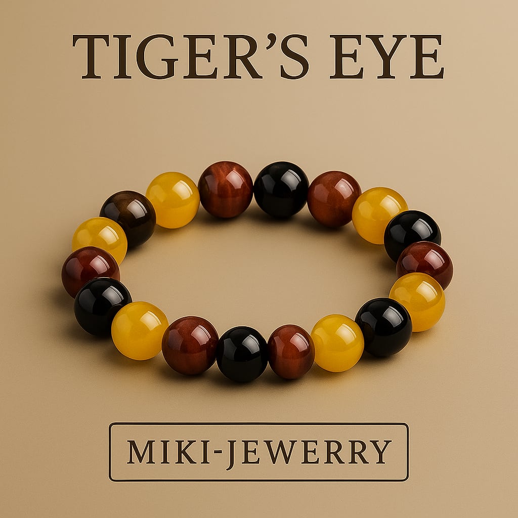 「MIKI-JEWELRY ゴールドタイガーアイ×レッドタイガーアイ×オニキスブレスレット」は、10mmの珠がリズミカルに並び、手首に心地よくフィットするデザインが特徴です。シンプルながらも優雅な印象を持つこのブレスレットは、ビジネスシーンやカジュアルな場面でも大活躍します。