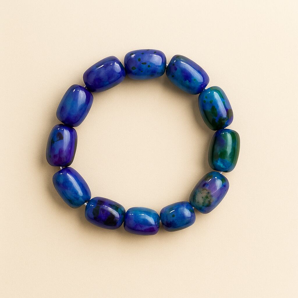 このブレスレットには、海のように深く、穏やかな青色のアゲートが使用されており、その色合いはまるで心を深い静寂に誘うかのよう。コラム状にカットされた珠は、優雅かつ洗練された魅力を放ち、身につけることで一層魅力的に見えることでしょう。