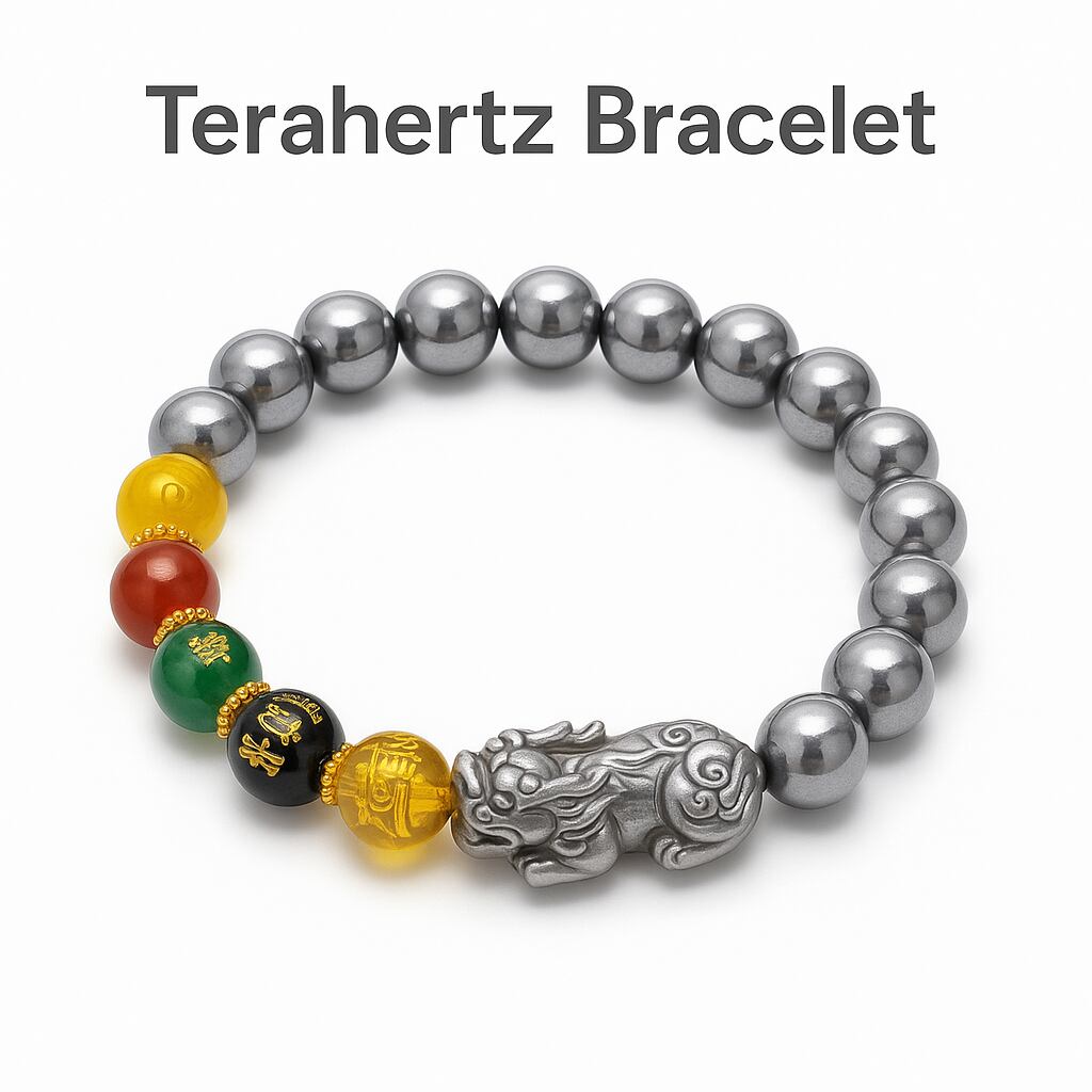 五方富の神 テラヘルツブレスレットは、重厚感あるメタリックデザインが特長の高品質アクセサリーです。テラヘルツ鉱石を使用しており、1秒間に約1兆回振動する周波数(テラヘルツ波)は、健康や美容に役立つアイテムとして注目を集めています。